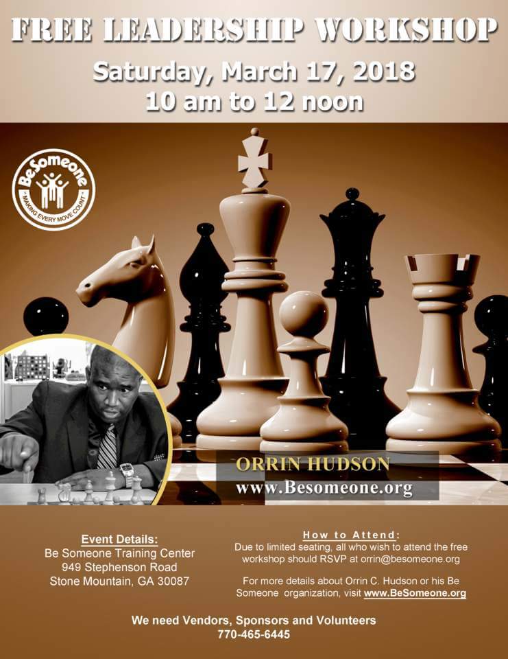 The free leadership workshop, hosted by Orrin “Checkmate” Hudson, will take place on Saturday, March 17th from 10 a.m. to 12 p.m. The workshop will be held at the Be Someone Training Center located at 949 Stephenson Road, Stone Mountian, GA 30087. Due to limited seating, attendees are encouraged to RSVP at orrin@besomeone.org to reserve a seat. Vendors, sponsors, and volunteers are welcome to attend this workshop. For more information, visit www.BeSomeone.org or call Orrin Hudson at 770.465.6445. Be Someone Free Leadership Workshop